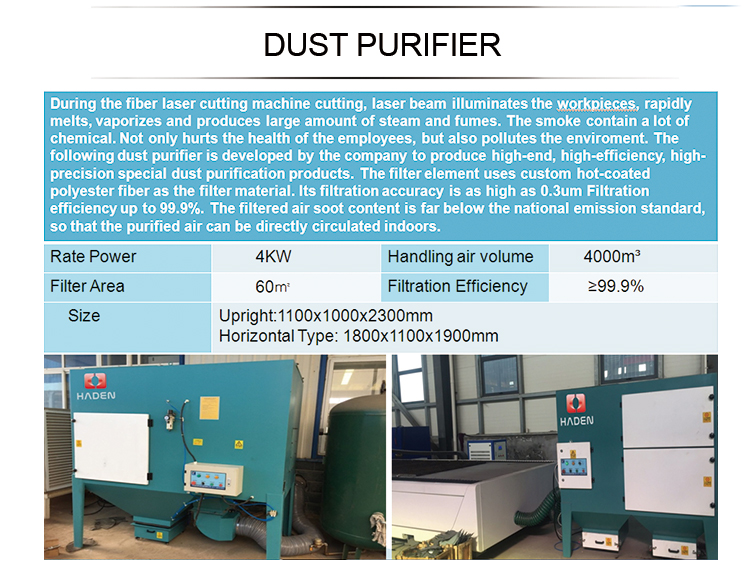 Haden CNC激光切割机还可以选装哈顿粉尘净化器,可以达到国家环保标准,还可以提高生产效率。